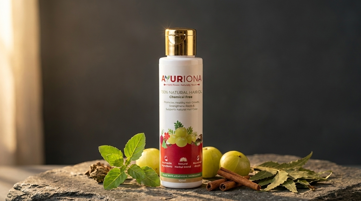 Ayuriona - 100% Natural Hair Oil. Rooted in Ayurvedic tradition, it nourishes the scalp, strengthens hair, and supports healthy growth—naturally and gently.